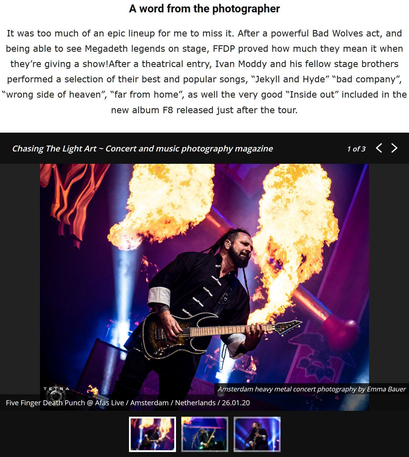 I've joined the Chasing The Light Art family back in 2019, a photographer's directory and web mag providing articles and live reviews about all genres of music but mainly rock, throughout pit photographer's work from all around the world.